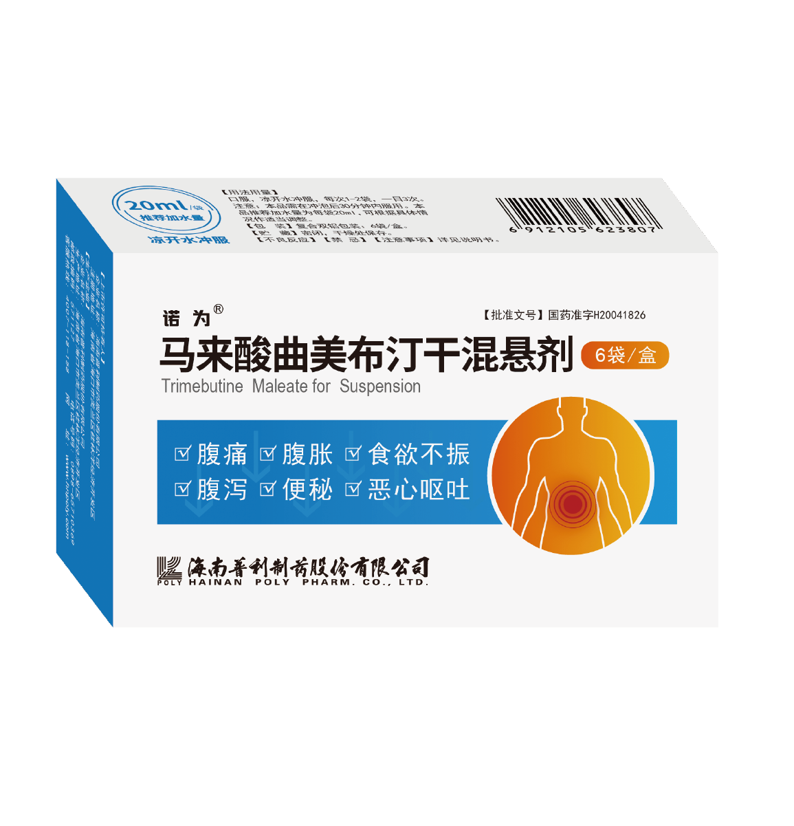 马来酸曲美布汀干混悬剂用于胃肠道功能紊乱引起的食欲不振、恶心、呕吐、嗳气、腹胀、腹鸣、腹痛、腹泻、便秘等症状的改善。亦可用于肠道易激惹综合征。本品为白色或类白色粉末或颗粒;气芳香,味甜。用凉开水冲服,每次1~2袋,一日3次。为保证口感,需在冲泡后30分钟内服用。推荐加水量为每袋20ml,可根据具体情况作适当调整。